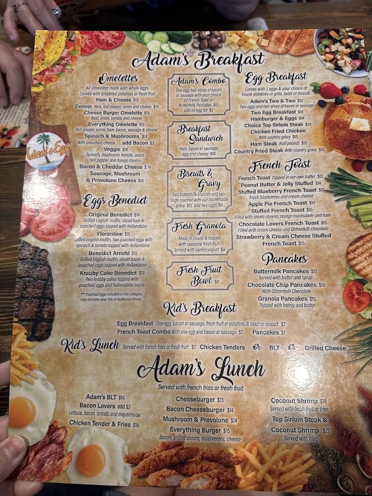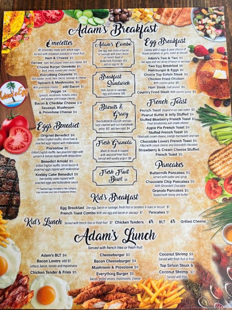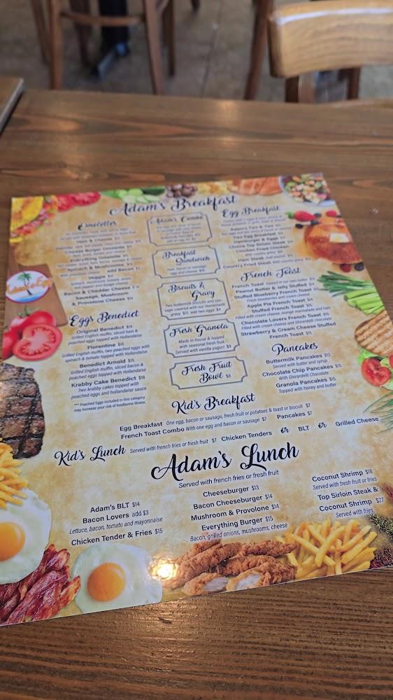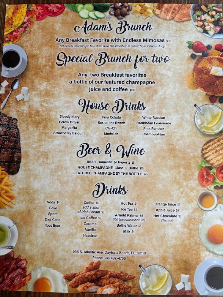 Welcome to Adam's Egg, your go-to destination for comforting American fast food in Daytona Beach. Conveniently located at 935 S Atlantic Ave, we specialize in hearty breakfasts and satisfying lunches, all served in a relaxed, inviting atmosphere. Our menu features delicious local specialties, complemented by excellent coffee and a selection of drinks, including vegetarian options. Whether you’re looking to dine in, grab takeout, or place an order for delivery, we’ve got you covered with quick service and accommodating amenities, including wheelchair accessibility. Stop by and enjoy a delightful meal that feels just like home!